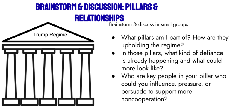 - Who are key decision-makers in those pillars who we could influence, pressure, or persuade to support more noncooperation?